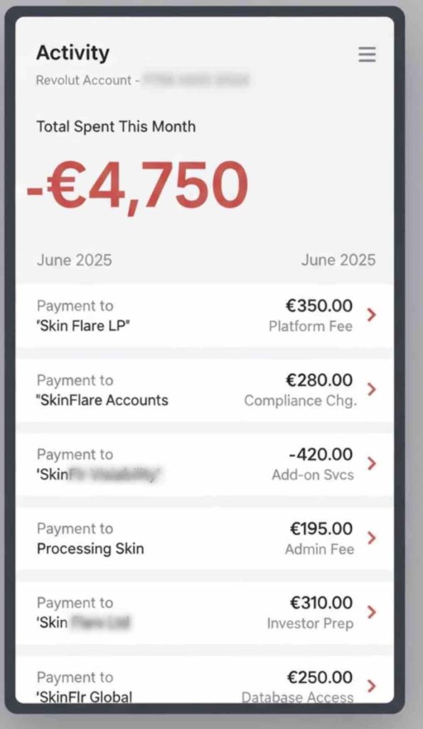 Image: – Evidence trail: enrollment invoice, subsequent “fee” invoices, bank transfer records showing multiple small payments, recorded Zoom session where a Skin Flare rep promises an investor pitch that never occurred.
